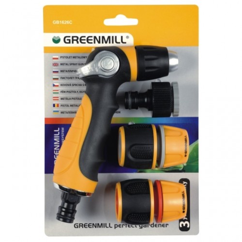 Set de conectori GB1626C, set complet de stropit. conține: duză de pistol de pulverizare, conector universal de robinet 3 / 4-1 / 2 ", conector rapid 1/2", conector rapid de scurgere 1/2 ". Ieșire de apă reglabilă: de la jetul dur la ceața fină.