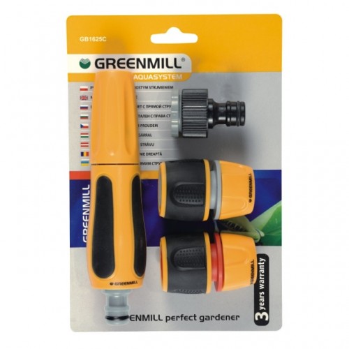 Set de conectori GB1625C, conține: duza de pulverizare reglabilă, conector universal de robinet 3 / 4-1 / 2 ", conector rapid 1/2", Ideal pentru udare și curățare. Jet de apă reglabil de la jetul dur la ceața fină. Cu oprirea debitului de apă.